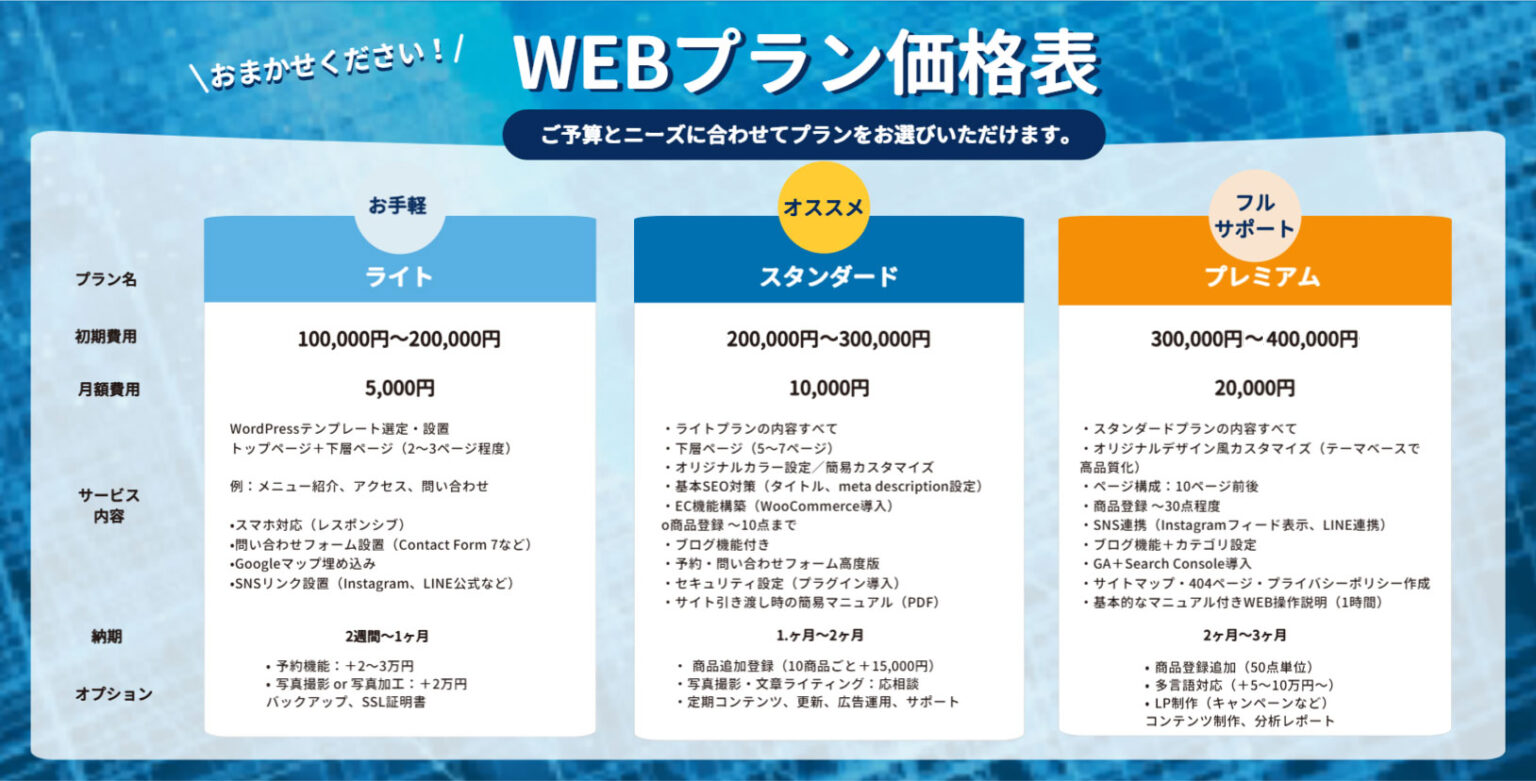 ※月額費用に関してましては、ドメイン・サーバーなどお客様ご自身で管理される場合にはかかりません。